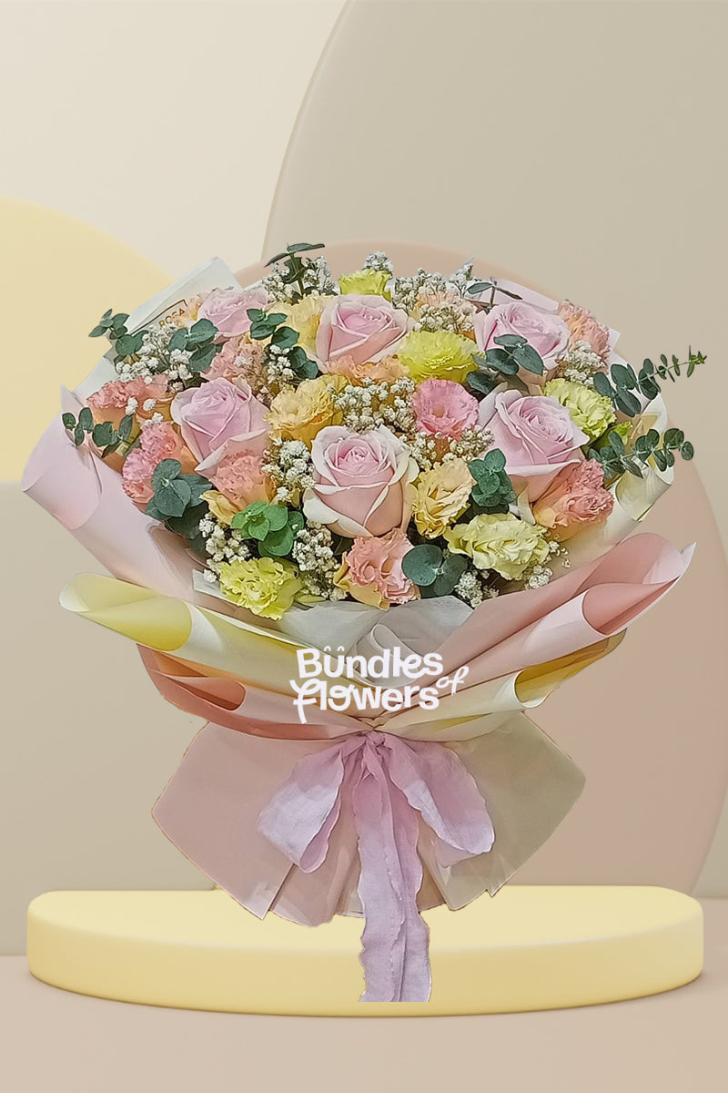 This graceful floral arrangement combines six soft blush pink roses with six peachy lisianthus flowers, accented with complementary fillers in a bouquet molder. Perfect for conveying heartfelt emotions, this bouquet radiates elegance and charm. Whether marking a milestone or simply brightening someone's day, this thoughtfully composed arrangement delivers warmth and beauty that resonates with every recipient.