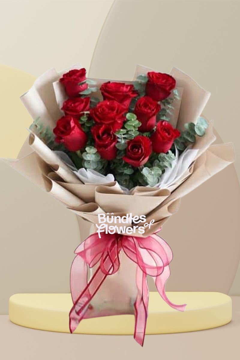 A stunning arrangement of 10 premium imported red roses, thoughtfully curated as the perfect gift to express your deepest feelings. Each bloom is hand-selected for its vibrant color and elegant form, making this bouquet an ideal choice for celebrating love, romance, or any special occasion that deserves something truly memorable.