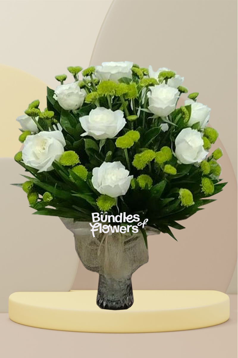 A sophisticated floral composition featuring ten pristine white roses complemented by twelve verdant button chrysanthemums, artfully arranged in a vase. This refined combination balances classic elegance with natural texture, creating a timeless display suitable for any occasion or interior setting.