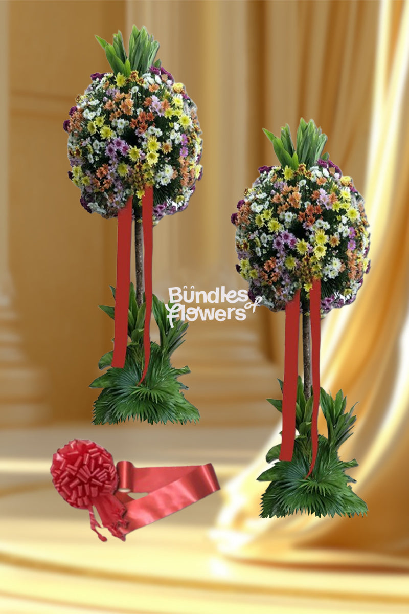 Elevate your ribbon-cutting ceremony with this sophisticated dual-arrangement package. Each topiary stands at an impressive 5 feet, showcasing a vibrant medley of Malaysian chrysanthemums in complementary hues. The set includes a coordinating red ribbon, perfectly positioned for a polished ceremonial moment. Ideal for grand openings, inaugurations, and milestone celebrations requiring professional floral presentation.