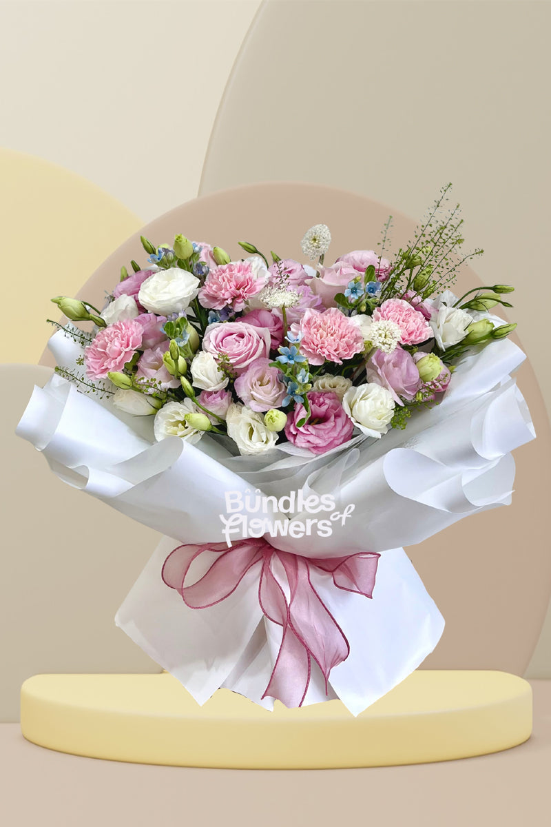 This elegant arrangement features three premium pink roses paired with four delicate pink carnations, complemented by eight graceful lisianthus blooms and four sprigs of oxypetalum. The combination creates a sophisticated composition that balances classic romance with contemporary refinement, ideal for expressing admiration or celebrating special moments with understated elegance.